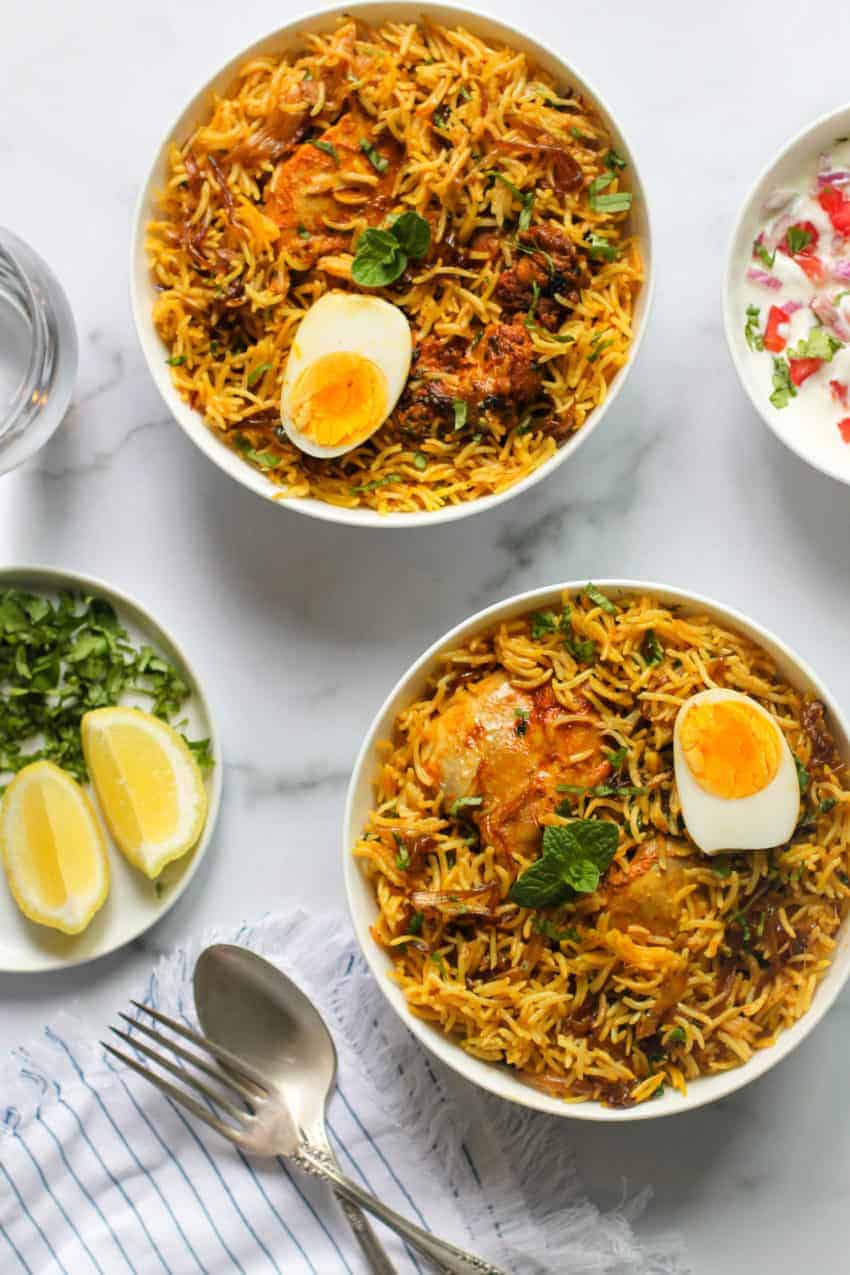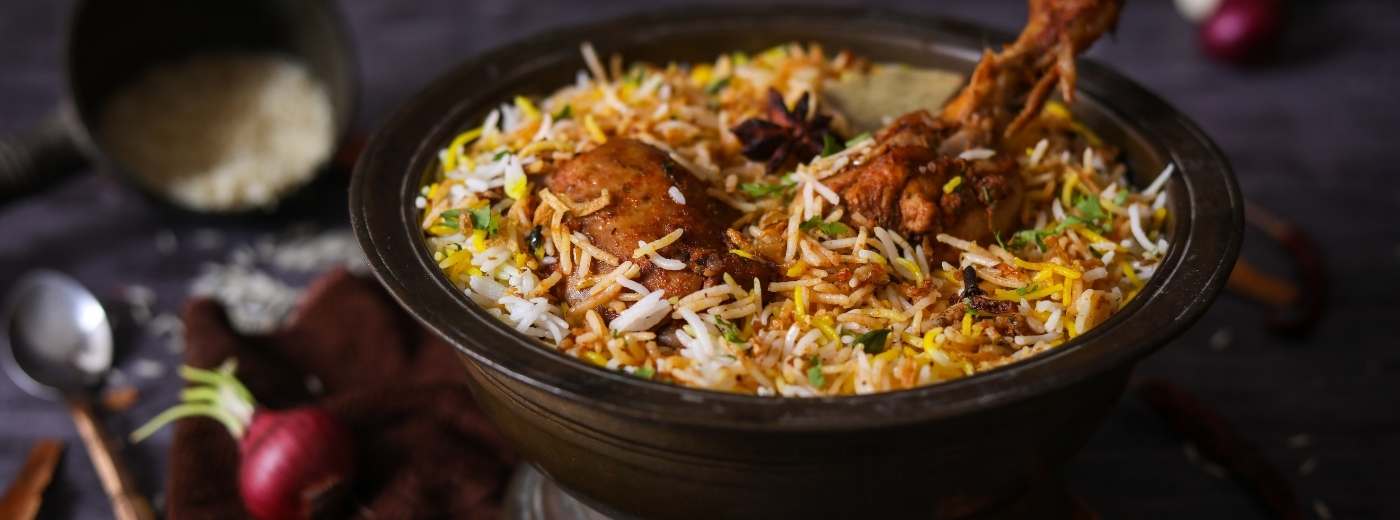 Hyderabadi chicken biryani is an aromatic, mouth watering and authentic Indian dish with succulent chicken in layers of fluffy rice, fragrant spices and fried onions.